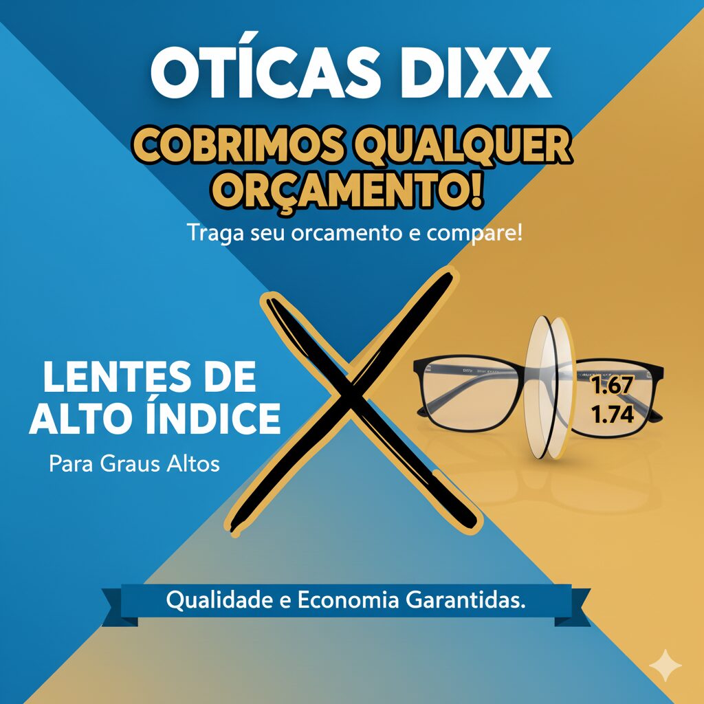 Entendemos como é frustrante pagar caro por lentes mais finas e leves. Por isso, na Ótica Dixx, temos preços imbatíveis em lentes de alto índice (1.67 e 1.74).